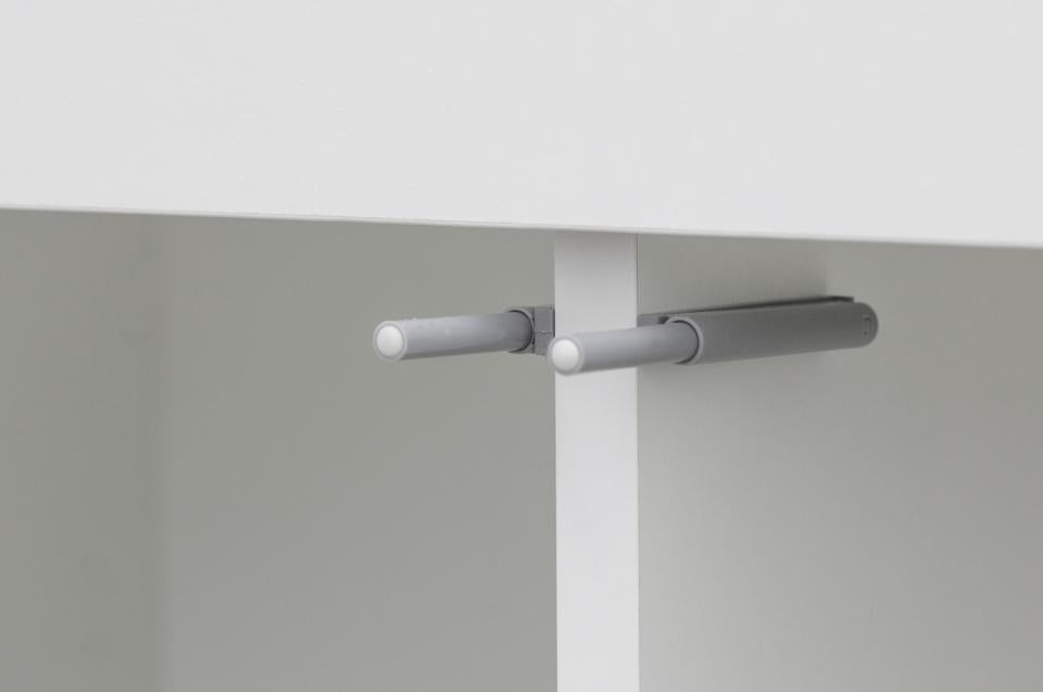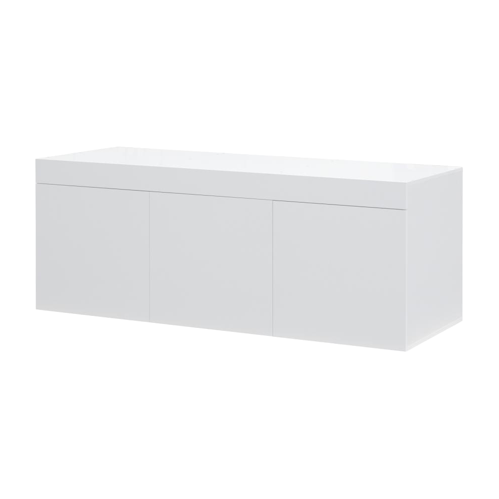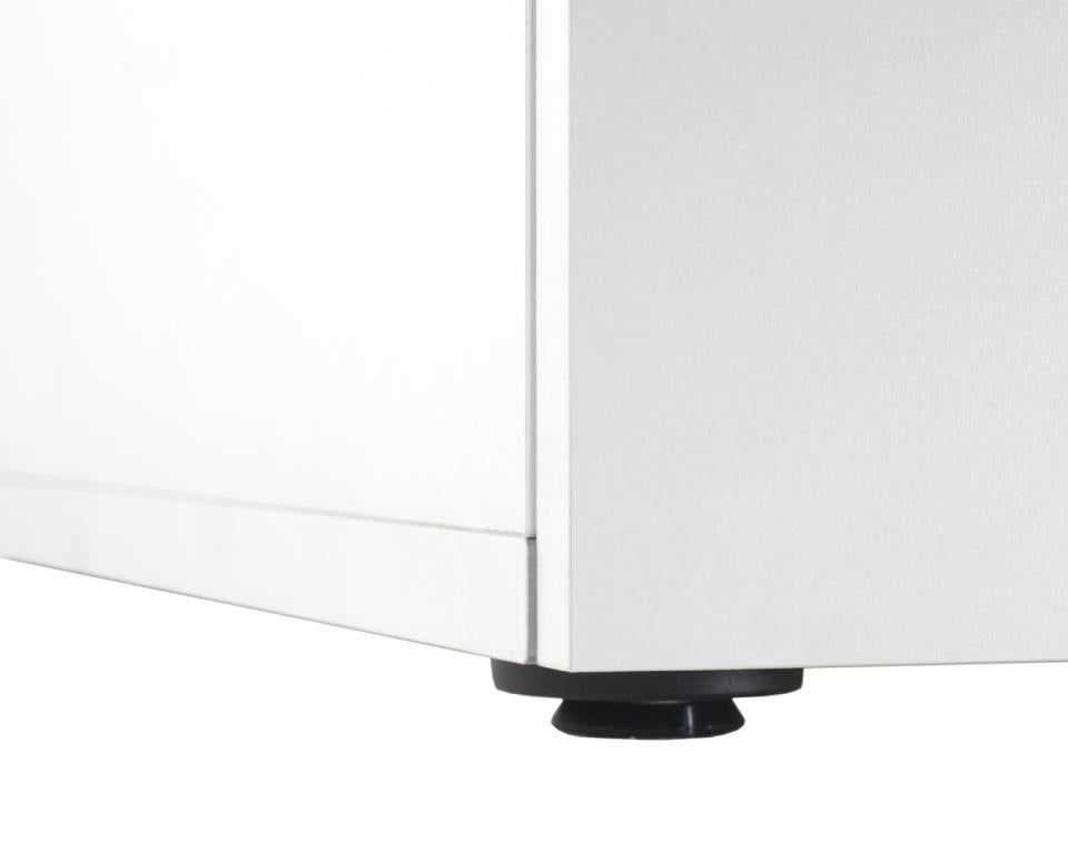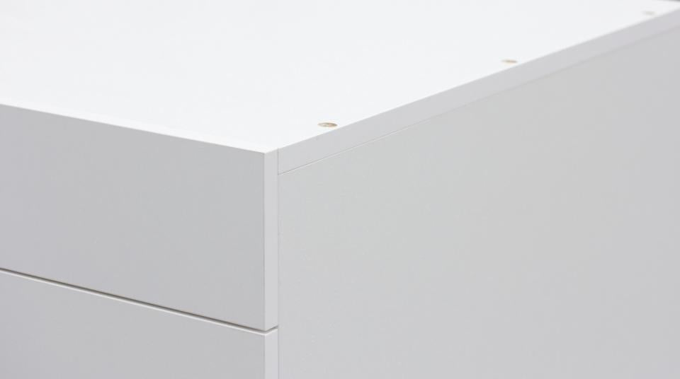 - Egenskaper: Möbeln är tillverkad i solid vit melaminplatta där de bärande delarna är 19 mm tjocka och luckor samt hyllor 16 mm. Aluminiumprofilen mellan luckorna gör det enkelt att greppa och öppna. Samtliga kanter är försedda med pålimmade kantband, även de dolda, vilket ger ett extra gott skydd mot vatten och fukt. På baksidan finns två stora genomföringshål för kablar och filterslangar samt ett hål i mellanväggen som gör det enkelt att dra teknik mellan skåpets olika sektioner. Möbeln levereras med två eller tre flyttbara hyllor som kan placeras efter behov.