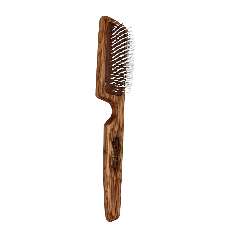 En handgjord borste utformad för att reda ut tovor, knutor, lösa hår och underull på ett varsamt sätt. De vinklade piggarna med skyddande knoppar gör borstningen effektiv utan att irritera huden. Perfekt för både vinkelborstning, ben och rak borstning av kroppen.
