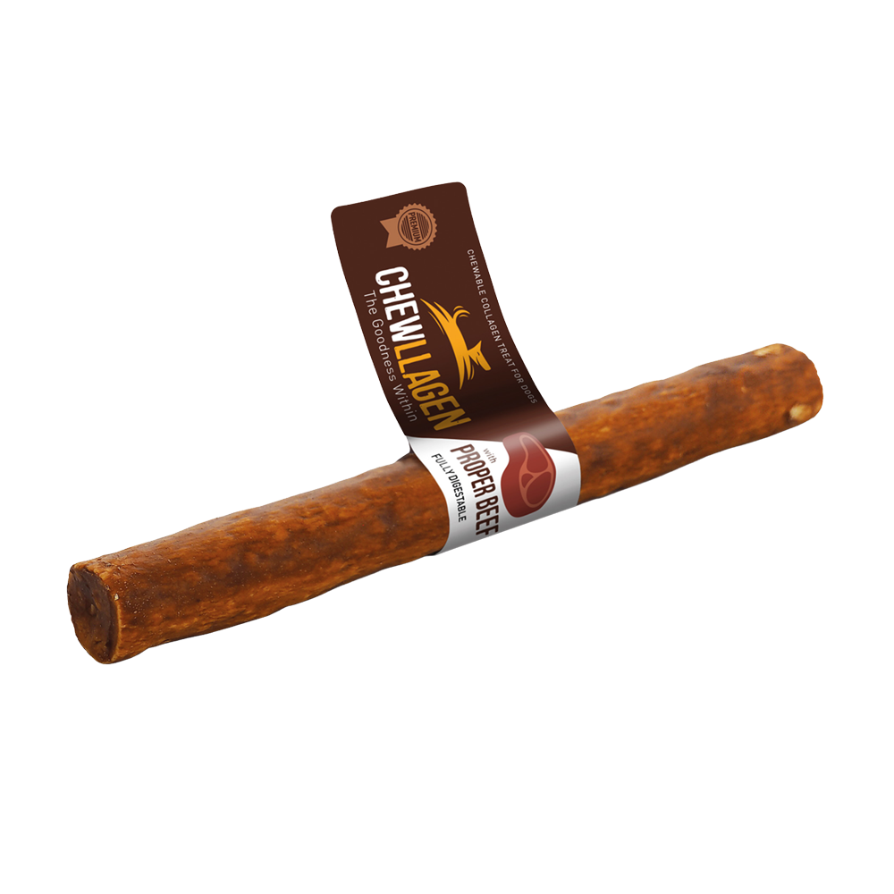 Chewllagen Tuggrulle Nöt är ett smakrikt och funktionellt tugg tillverkat av 100 % kollagen från ogarvad nötkreaturhud och doppat i välsmakande köttsås från nöt. Kollagen är en naturlig och lättupptaglig proteinkälla med flera viktiga funktioner i hundens kropp, vilket gör tuggrullen till ett utmärkt val för både sysselsättning och välmående. Tugget är helt smältbart och passar hundar i alla storlekar.